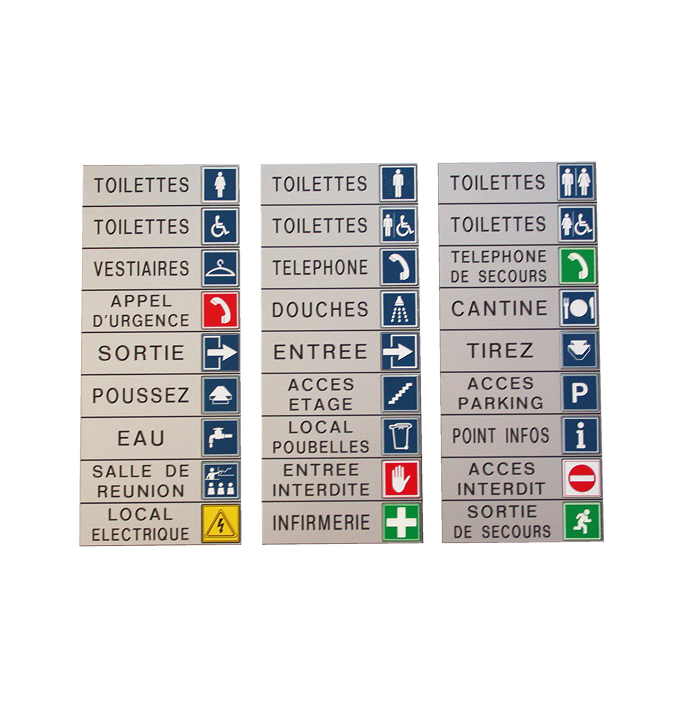 Nos panneaux signalétiques, figurines et pictogrammes sont gravés dans la masse, ce qui les rend totalement indélébiles.