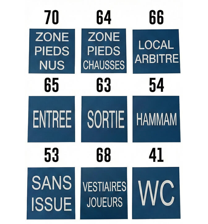 Nos panneaux signalétiques, figurines et pictogrammes sont gravés dans la masse, ce qui les rend totalement indélébiles.